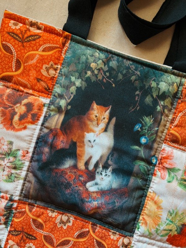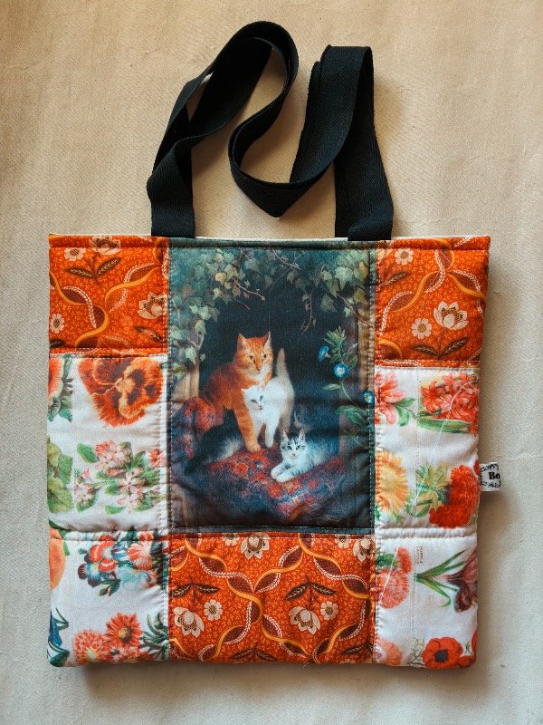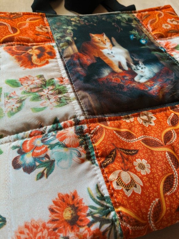 Bolsos acolchados realizados artesanalmente con la técnica de patchwork, combinando imágenes y telas, dorso matelaseado.