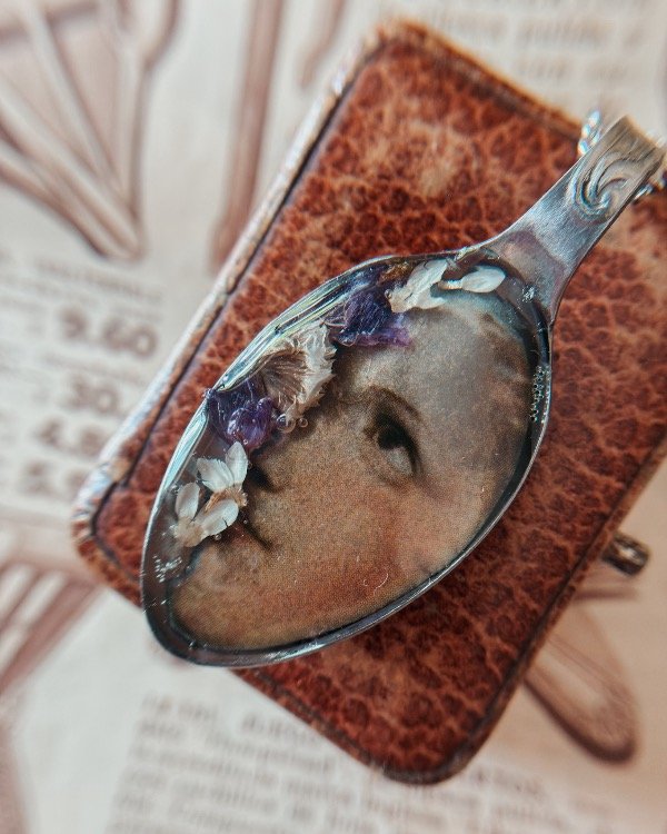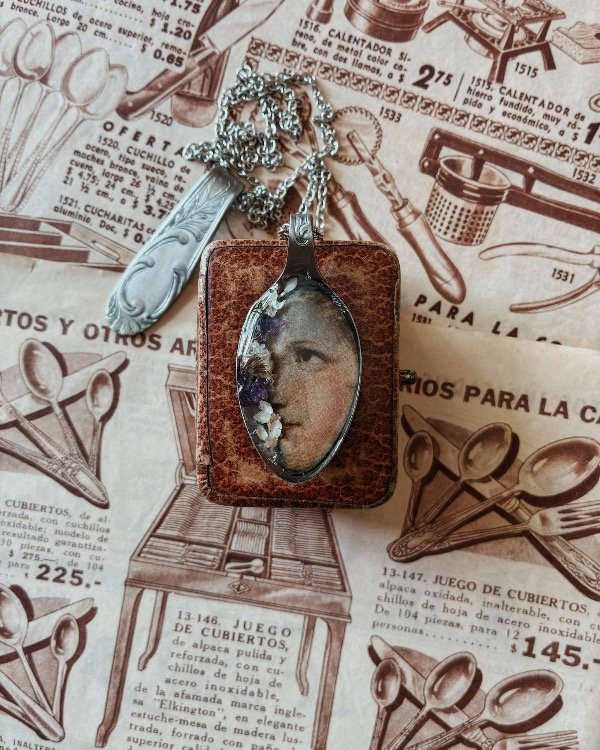 Los dijes se componen de fragmentos de cucharas antiguas intervenidas con imágenes y elementos naturales, sellados para su conservación.