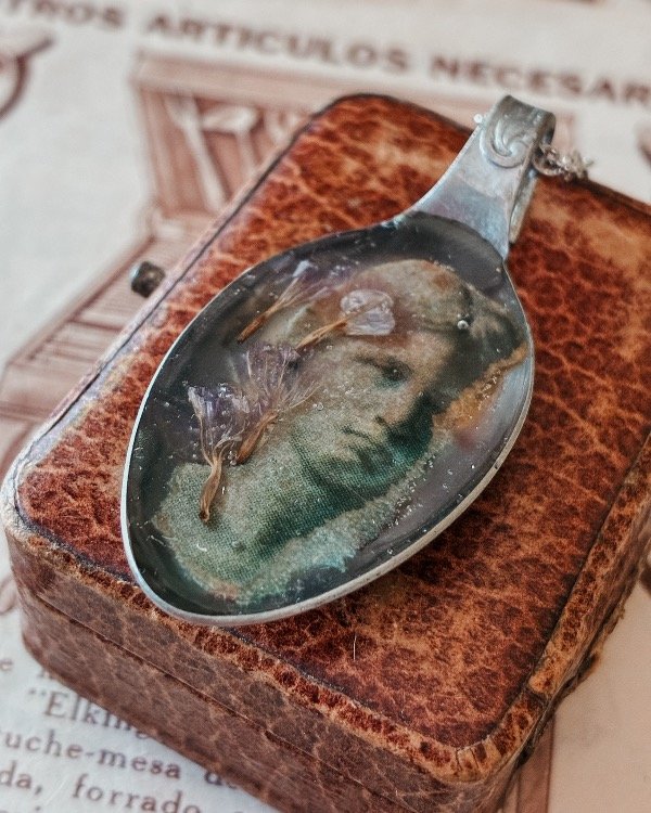 Los dijes se componen de fragmentos de cucharas antiguas intervenidas con imágenes y elementos naturales, sellados para su conservación.
