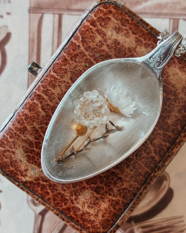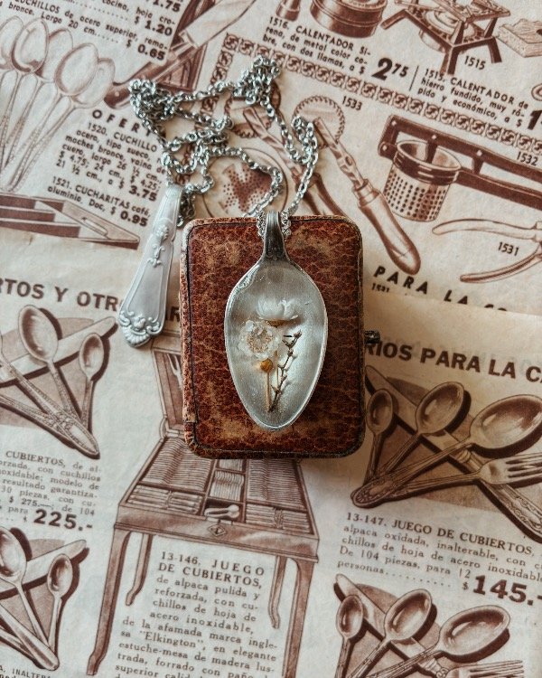 Los dijes se componen de fragmentos de cucharas antiguas intervenidas con imágenes y elementos naturales, sellados para su conservación.