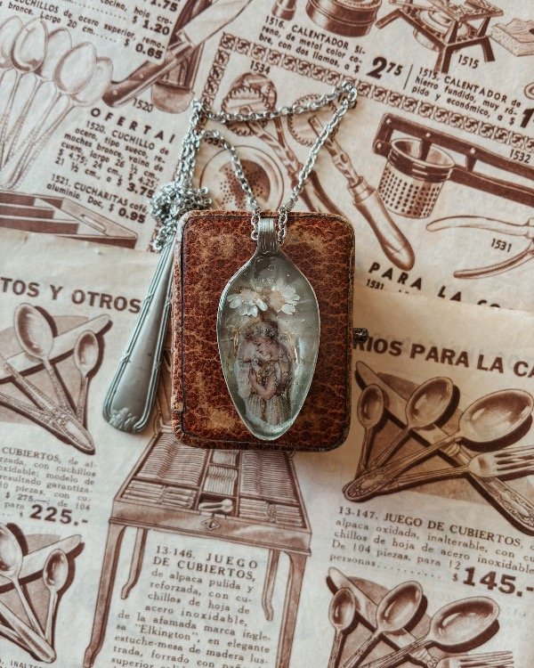 Los dijes se componen de fragmentos de cucharas antiguas intervenidas con imágenes y elementos naturales, sellados para su conservación.