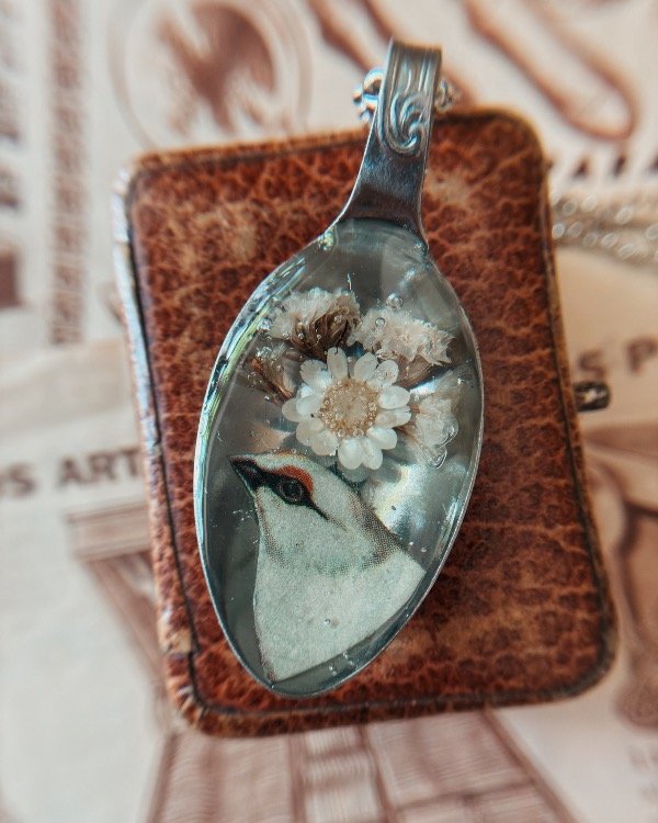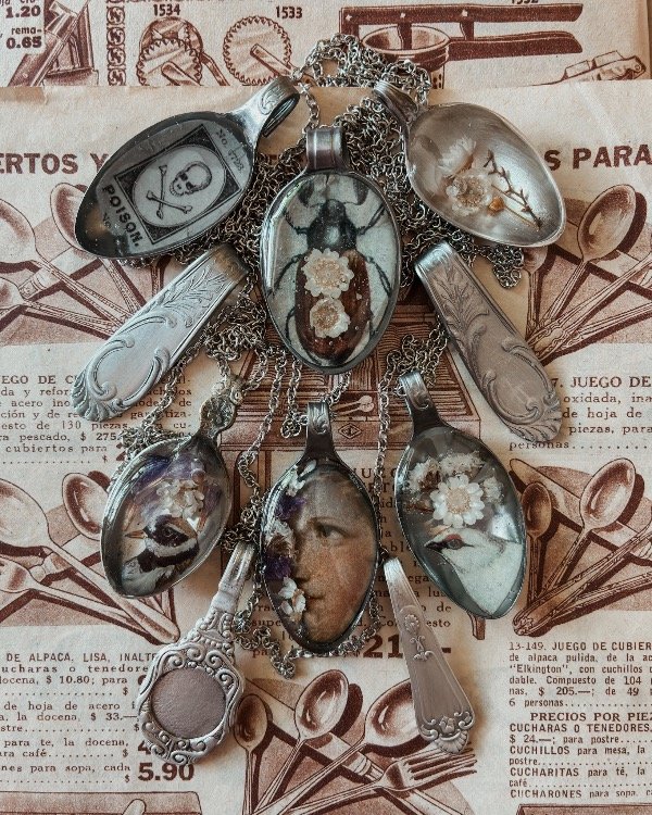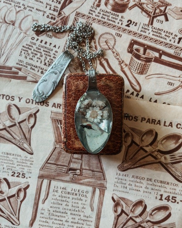 Los dijes se componen de fragmentos de cucharas antiguas intervenidas con imágenes y elementos naturales, sellados para su conservación.