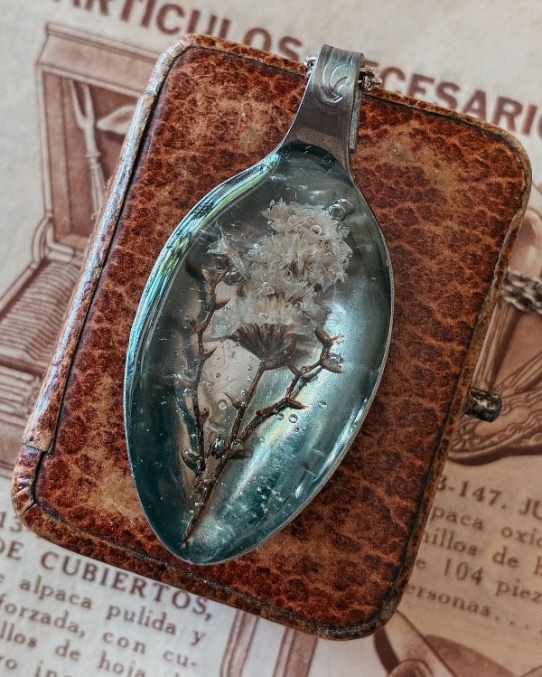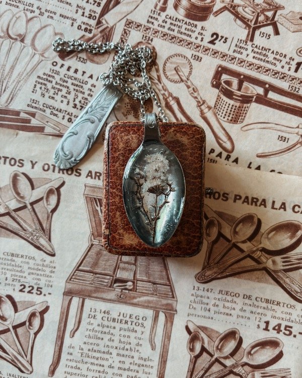 Los dijes se componen de fragmentos de cucharas antiguas intervenidas con imágenes y elementos naturales, sellados para su conservación.