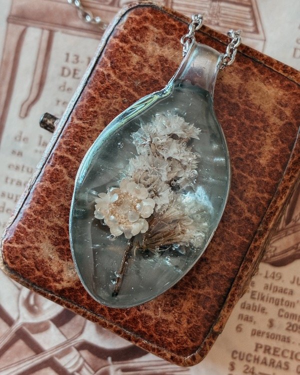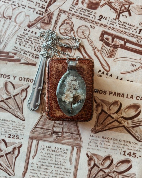 Los dijes se componen de fragmentos de cucharas antiguas intervenidas con imágenes y elementos naturales, sellados para su conservación.