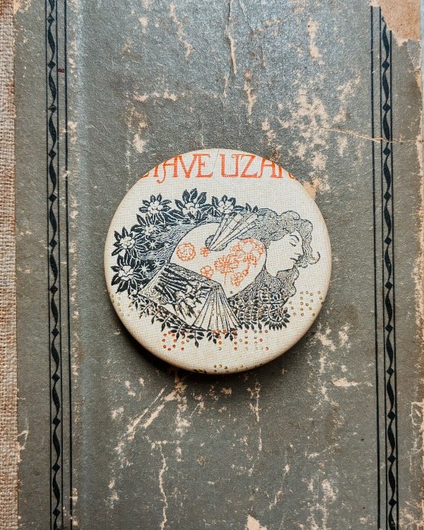 prendedor Metálico de 4 cm , cubierto con laminado mate textura de papel. Proyecto con scans originales de libros