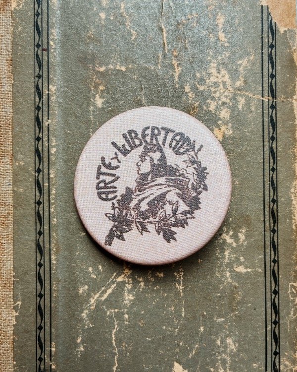 prendedor Metálico de 4 cm , cubierto con laminado mate textura de papel. Proyecto con scans originales de libros