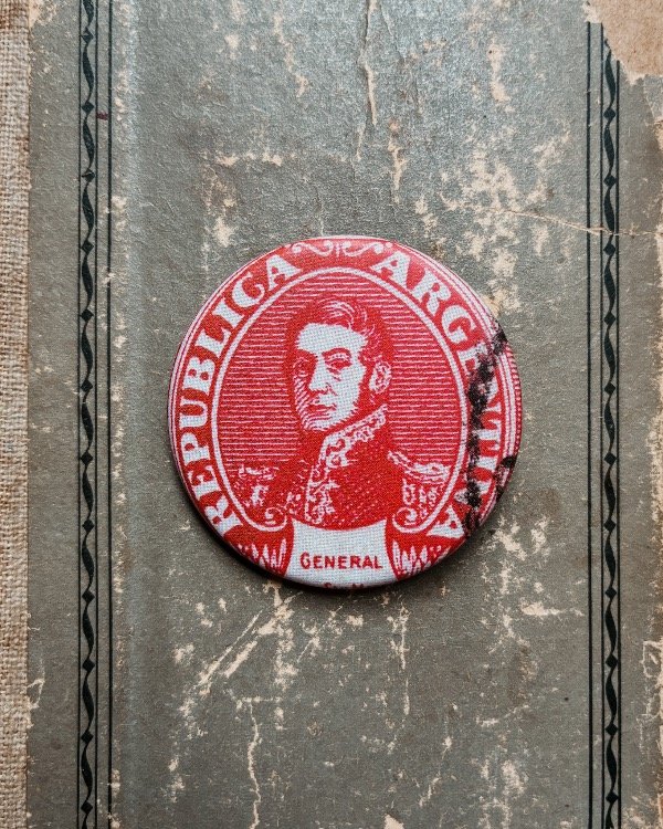 prendedor Metálico de 4 cm , cubierto con laminado mate textura de papel. Proyecto con scans originales de libros