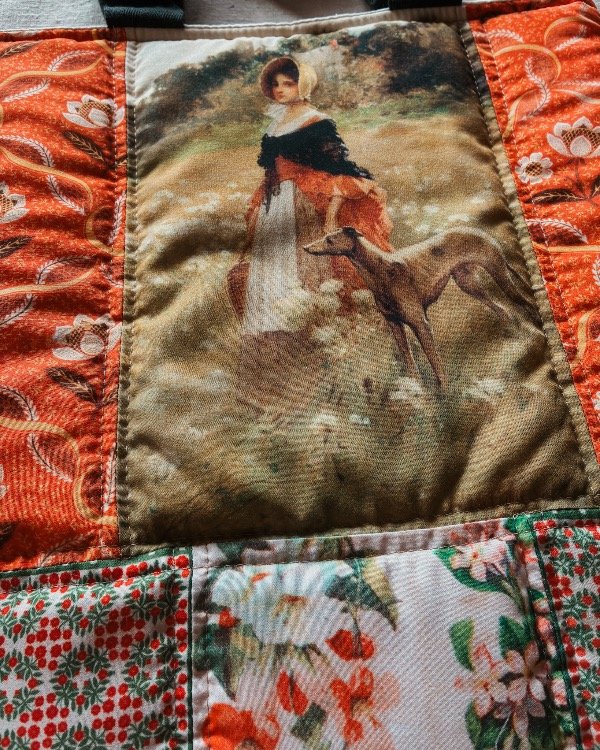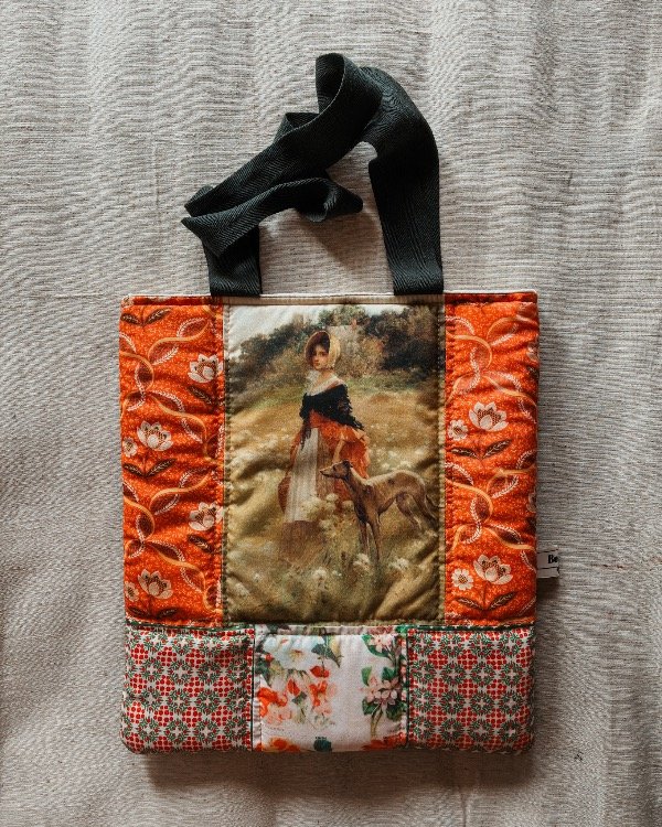 Bolsos acolchados realizados artesanalmente con la técnica de patchwork, combinando imágenes y telas, dorso matelaseado.