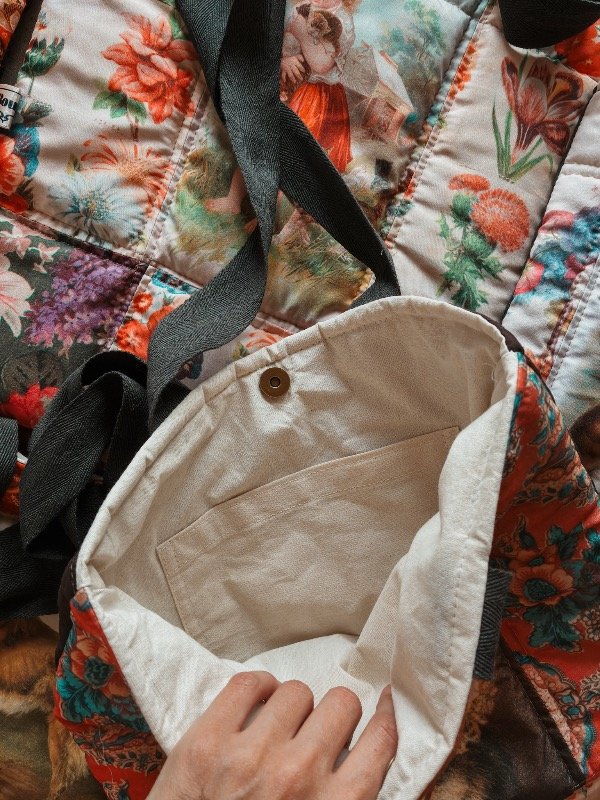 Bolsos acolchados realizados artesanalmente con la técnica de patchwork, combinando imágenes y telas, dorso matelaseado.