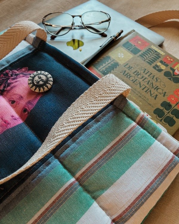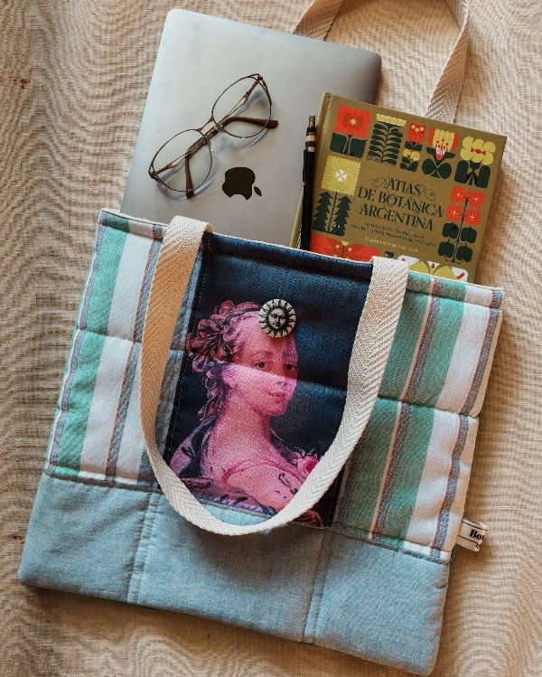 Bolsos acolchados realizados artesanalmente con la técnica de patchwork, combinando imágenes y telas vintage.