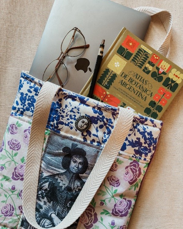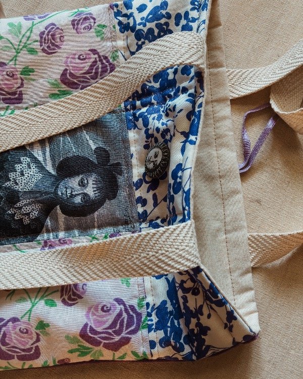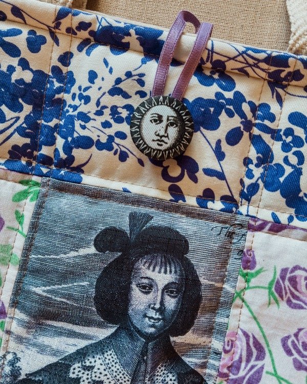 Bolsos acolchados realizados artesanalmente con la técnica de patchwork, combinando imágenes y telas vintage.