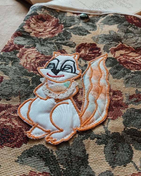 • Tela Gobelino con parche vintage, con cierre clip plástico.